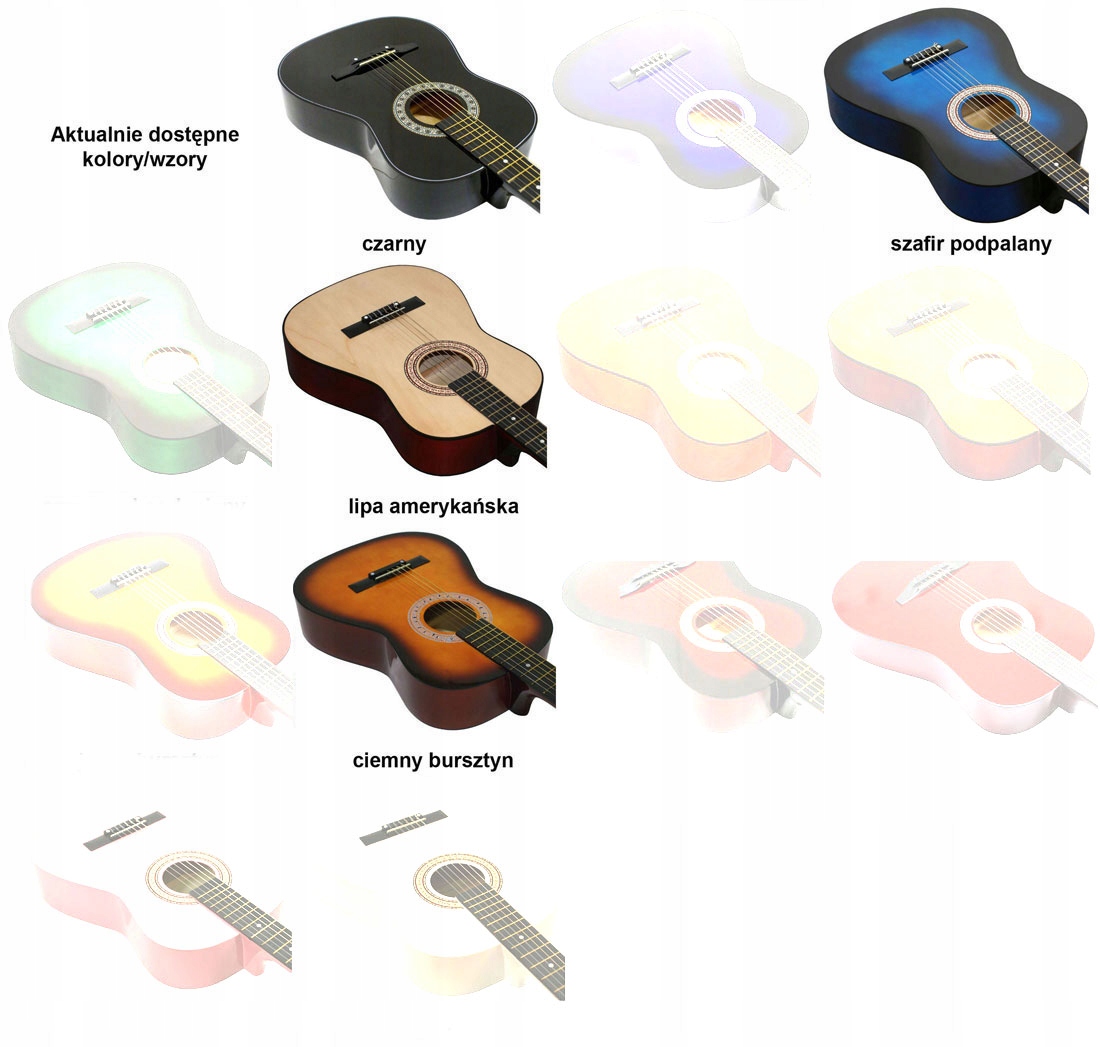 Мы предлагаем до 13 различных цветов + дополнительно множество дизайнов. После покупки, пожалуйста, выберите и сообщите нам, какой из них отправить. Список доступных на данный момент цветов/рисунков можно найти на миниатюрах. Примечание: яркие картинки без надписей означают, что гитара не представлена.