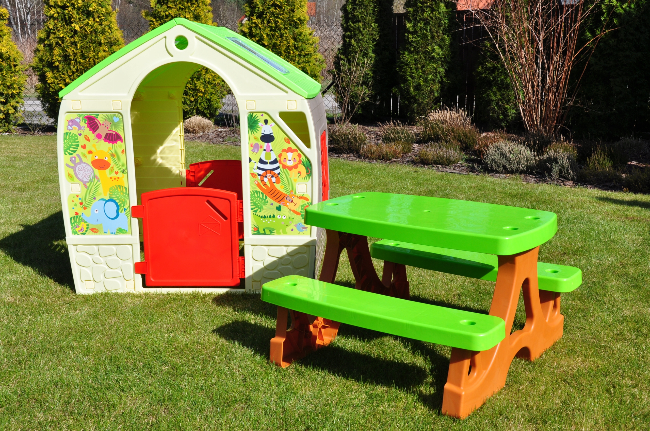 - Барвистий дитячий ігровий будиночок прикрашений веселою графікою тварин із джунглів.